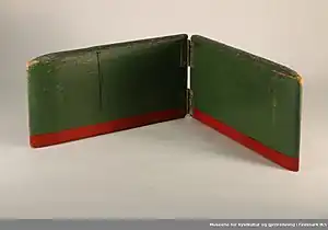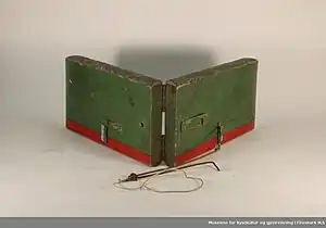 The otter may have multiple different designs. Otter boards used in bottom trawling are based on a similar principle of design. The design takes advantage of the shearing effect achieved when the board is positioned at an oblique angle to the current. The effect is reminiscent of that of a kite in the wind.[2][1] Different designs are found in Switzerland, the nordic countries, California and Japan. Most commonly the traditional board was made by wood, and had a length about two feet, a width of 6 inches and less than an inch thick. To enable it to float in an upright position it was equipped with metal weights made of lead or iron.[3] The correct amount of weights allows the board to float with only an inch or two above the surface. Snells, bated with flies or spoons are placed at intervals along the line. The snells would have different lengths due to the height above the water of the line along its length. An inch adjacent to the board and hip height adjacent to the fisherman. the longest snell would have been closest to the fisherman and the shortest closest to the board.[3] In Britain fishing with an otter was forbidden by the Salmon Fishery Act 1861, and this may have been one of the reasons why British anglers introduced it to Norway. The first ban on the device in Norway was imposed in 1870 an it was increasingly forbidden throughout the end of the century.[3]