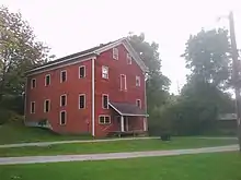 Built in 1845 by Edward Bullock, the mill is run by water power supplied by a dam on the river. The first mill on the site was built, in 1807, by partners John Earle and Paul Averill Jr.[4] The Averill family was from the Great Barrington area in Massachusetts, where Thomas Ingersoll had lived before coming to Oxford.[5] Paul Averill, Sr. had developed mills in Townsend township in the 1790s.[6] John Earle married Paul's daughter Mary and with Paul Averill Jr. managed the Townsend mills. In 1806, Earle purchased the land surrounding the mill site at Otterville and with his brother-in-law Paul (sometimes referred to as Paul Avery[7]) built the first mill on the site.[8] The South Norwich Historical Society, on a lease basis, maintains this historic site and offers tours on request. A beautiful setting in the center of the village, the mill and its surrounding meadow is the site of an annual barbecue.