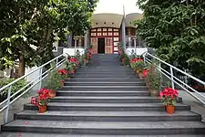 The church has a contemporary design with a square tower with two bells. The design of the Church of Our Lady of Fatima was commissioned by bishop of Macau Dom Paulo Tavares in 1965. The original project was to build a church and a school on two adjacent sites. By 1965 the Bishop told the architect that one of the sites was no longer available. The dilemma then was how to build a church and a school on a site designated for the church. Architect Antonio M. Jorge da Silva suggested that the school could be built below the church building, but the compromise would be that the access to the church would have many more steps. The suggestion and design was approved by the Bishop on condition that the project would be of low cost. To reduce the cost and to maintain a reasonable height in the interior of the church the structural beams were inverted to be on the roof leaving the interior ceiling free of beams. The church was to have been constructed with two colors of concrete to avoid future painting. The addition of a black cement admix would make the church beams and exterior panels a medium grey leaving the curved under panels over the windows almost white.