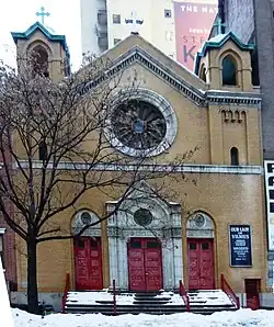 The yellow brick Lombard-Gothic church with Gothic Revival and Gothic Revival details was built for $25,000 in 1910 to designs by theatre architect Harry G. Wiseman of 104 West 42nd Street; the rector during construction was listed as Rev. Joseph L. Shestokas of 7 Vandam Street.[1] Wiseman was listed that year as the architect of two venues for Penn Amusements, including a modest brick theatre at 223 West 42nd Street, and an "open-air moving picture show" on the southeast corner of 111th Street and Eighth Avenue.[1]