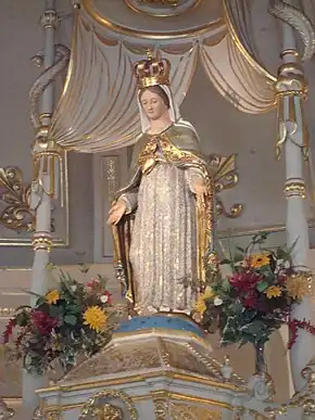 The statue represents Our Lady standing, in an attitude reminiscent of that of the Miraculous Medal. The eyes are modestly downcast; the facial expression pleasant. Her head is covered with a white veil; her garments gilded and ornamented. Her bare feet crush the serpent coiled on the top of a star-studded globe. The statue was originally placed in an alcove containing the altar of the Confraternities of the Holy Rosary, before being re-located to above the main altar.[1]