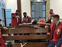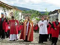 In Pirenópolis, the manifestations of the religious traditions of Holy Week have been held since the XVIII century, funded by brotherhoods, such as the Blessed Sacrament, and housed exclusively in parish churches.[7][21] The rites of the celebration of the Passion of Christ, liturgical and paraliturgical acts, constitute an exceptional cultural moment, of emotional and affective value to the people of the place, and has been conceived since its origin and was the celebration of greatest local expression; it is the period when most celebrations were held.[21][42]