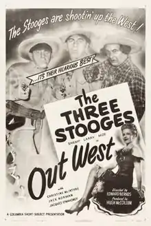 Out West is a 1947 short subject directed by Edward Bernds starring American slapstick comedy team The Three Stooges (Moe Howard, Larry Fine and Shemp Howard). It is the 99th entry in the series released by Columbia Pictures starring the comedians, who released 190 shorts for the studio between 1934 and 1959.