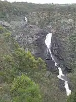 The Apsley Falls are located 20 kilometres (12 mi) east of Walcha, 1 kilometre (0.62 mi) off the Oxley Highway. Here the Northern Tablelands plateau drops precipitously into the rugged gorges carved out by the Aspley and upper Macleay Rivers which meander through the park. There is a 52-metre (171 ft) steel stairway leading to an observation deck (with disabled access) where there are great views of the deep gorge and the falls. There are two large falls, with two walking tracks taking in the Gorge Rim Walk and the Oxley Walk, picnic facilities and camping area for overnight stays. On 28 December 2009 the steel footbridge leading to Gorge Rim Walk was washed away.[12]