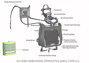The Oxygen breathing apparatus (OBA) is a closed circuit oxygen rebreather. used primarily in firefighting by the US Navy. Its oxygen is generated by chemicals contained in the green canister, which is inserted at the base of the breathing device. [1] The scrubber canister uses potassium superoxide as both a carbon dioxide absorbent and as an oxygen source. A sodium chlorate oxygen candle in the base of the unit generates oxygen on start-up as the canister has to reach a high internal temperature before it will start generating oxygen. The circulation of exhaled air containing carbon dioxide through the canister starts the chemical process, usually taking less than five minutes to reach a stable state, which is the normal burn time of the "candle", and the mask will initially fill with a light, harmless smoke. The heat of the chemical reaction requires the use of thick leather gloves for handling spent canisters. The bags along either side of the chest unit cool the air mixture before inhalation and is a surprisingly effective system, with the air being quite cool when entering the face mask. There is a 60-minute timer at the top of the chest unit which, during the fighting of a casualty, is set for only 45 minutes. This would give the user a 15-minute window to evacuate to a safe atmosphere. Though bulky, it is light and comfortable to wear and does not much interfere with the user's freedom of movement. [2]