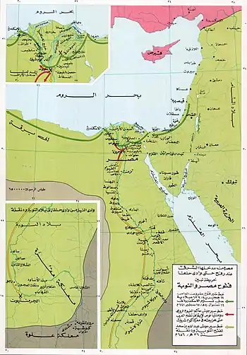Map showing the path of the Islamic armies and their conquest of Egypt and Nubia during the reign of the second Caliph Omar Ibn Al-Khattab.