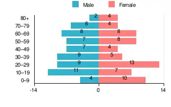 | Total | 0–9 | 10–19 | 20–29 | 30–39 | 40–49 | 50–59 | 60–69 | 70–79 | 80 + | ||||||