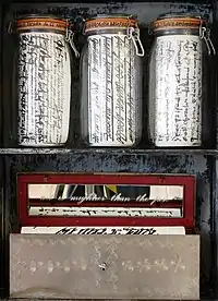Letter to Marcel Broodthaers, 2005. Cabinet with canvas rolls in glass pots. Safe with canvas roll under mirror deck with text 'Art is Mightier than the Pen'