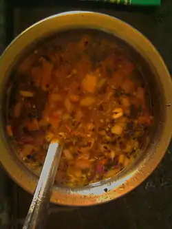 Typically this dish is prepared with tamarind with onions, chillies, and jaggery. Other typical seasonings may be added, such as coriander, curry leaf, or garlic. In the summer when mangoes are abundant, tamarind is replaced by stewed raw mango.[4][5]