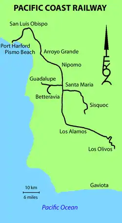 The Pacific Coast Railway was a 3 ft (914 mm) narrow gauge railway on the Central Coast of California. The original 10-mile (16 km) link from San Luis Obispo to Avila Beach and Port Harford was later built southward to Santa Maria and Los Olivos, with branches to Sisquoc and Guadalupe.