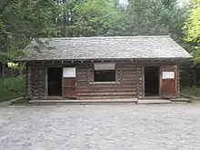 The Paektusan Secret Camp is claimed to be a former military base on Mount Paektu, and the supposed birthplace of Kim Jong-Il,[1] though he was born in the USSR. The North Korean government claims that it played an important role in the resistance against the Japanese occupation of the Korean Peninsula, and was occupied by the Korean People's Revolutionary Army.[1][2] Official photos and descriptions of the location depict there being a log cabin and several barracks at the site. They also describe a monument with a poem dedicated to Kim Jong-Il and allegedly written by Kim Il-Sung located near the camp. The location is currently used to support both Kim Il-Sung and Kim Jong-Il's cult of personality.[3]