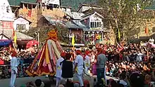 Folk dance performed by the Bhaderwahi-Pahari people - Speakers of Lahnda (Western Punjabi)[15] dialects including Pahari–Pothwari in Azad Kashmir and Hindko. The dialects of the Pahari-Pothwari language complex cover most of the territory of Jammu and Azad Kashmir.[16] People of Azad Kashmir despite not being ethnic Kashmiris possess a strong sense of Kashmiri national identity that overrides linguistic identification with closely related groups outside Azad Kashmir,[17] such as the Pothwari Punjabis.[18] The dialects are also spoken further east across the Line of Control into the Pir Panjal mountains in Indian Jammu and Kashmir. The population, estimated at 1 million,[19] is found in the region between the Jhelum and Chenab rivers: most significantly in the districts of Poonch and Rajouri, to a lesser extent in neighbouring Baramulla and Kupwara,[20] and also – as a result of the influx of refugees during the Partition of 1947 – scattered throughout the rest of Jammu and Kashmir.[21]