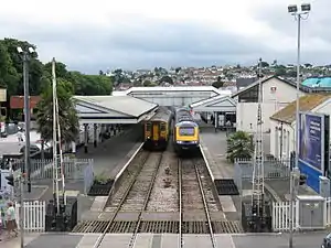 Paignton railway station serves the town and seaside resort of Paignton in Devon, England. It is 222 miles 12 chains (358 km) from London Paddington, via Box.[1] It opened in 1859 and is now the terminus of Riviera Line services from Exeter and heritage services on the Dartmouth Steam Railway from Kingswear.