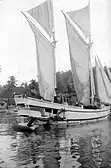 In the 18th century, Bugis people sailed a type of perahu similar with patorani. The hull is from pajala type, the rig is using a canted triangular sail in a tripod mast, with weight less than 50 tons. Many of them can bee seen in Australian beach collecting teripang between 1800–1840.[5] In 1880, a boat dubbed "Bugis prahu" seems to have been the prototype of palari hull. It was a midway development to palari, with western-styled deck but with traditional (indigenous) stern (the ambeng stern). A bowsprit and jibsail has been added, but it's still using a tanja sail on a single tripod mast. There was no cabin at the stern.[6]