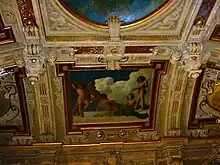 One of the reception rooms was decorated by the fresco painter Luigi Gainotti (1859—1940) with an exaltation of Genoa's merchant activity,[2] while the decoration of the walls and the vault of the staircase was entrusted in 1883 to the painter Cesare Viazzi (1857—1943) who produced a cycle of seven works celebrating the Sabard dynasty using the tempera technique (L’Italia del Popolo, The Monarchy swears allegiance to the Statute, Slavery with tied hands looks at Buonarroti’s dome, Italy sits on the throne of Rome, The Wars for the Unity of Italy commemorated by putti with festoons (2), Putti support the Savoy coat of arms that is not visible in the Tricolour of Italy).