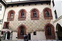 Also in Vitaliano's time, two courtyard wings were constructed behind the older building: the first, a small service court, was for horses, merchandise, and business transactions, while the second court, behind it, is larger and functioned as the formal entrance space to the house (cortile d'onore) for the family and their guests. The columns forming porticoes in the courtyards (severely damaged in 1943 and restored) are short and sturdy, carved from serizzo (a type of granite), with capitals of large, stylized leaves; they also carried pointed arches. The inner courtyard is the part of the house that is best preserved; some of the original frescoes are still visible. In the courtyard itself, frescoes on the three walls above the porticoes were badly damaged. On the fourth side is a building called the palazzina (little palace), which fortunately retains most of its decoration. Six large arched windows and one small square window adorn its two-story facade, with elaborate terracotta frames characteristic of the period in Lombardy. The brick wall of the palazzina was plastered and painted with a colorful repeating pattern of a count's coronet, groups of rings (a heraldic motif), and the Borromeo motto, humilitas (humility).[10]