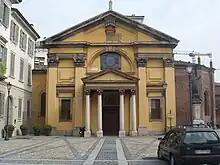 To the right of the church's entrance, a copper statue of 1691 by Dionigi Bussola depicts Saint Charles Borromeo (1538-1584), Cardinal-Archbishop of Milan, the most famous and revered member of the family.[17]