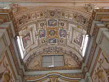 The interior decoration reflects the two phases of construction: in particular, the two vestibules on the ground and main floors, completely covered in late Renaissance decoration, have survived intact. Here the inspiration to Roman models and in particular Raphaelesque ones is evident on the part of Castello, author of the design and the frescoes enclosed between the stuccoes and grottesche. On the ground floor, delicately modulated white stucco frames run between fanciful, minute grotesque decorations and larger frescoes depicting full-length Olympian deities, while the central octagons depict Juno and Leda. On the side walls and on the Vault of the vestibule of the main floor, which is brighter, the colours of the decorations become brighter. They too are entirely covered, thanks to Bergamasco's intervention, with stuccos and grotesques and frescoed panels representing Apollo Citaredo with the Muses and Musician figures. Here too the unity of the architectural and decorative project is evident.[3]