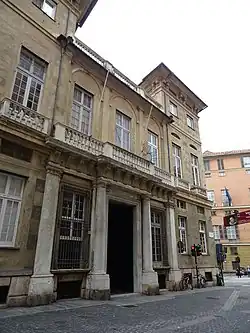 Stefano Lomellini's palace was included in the rolls of Genoa from 1588 to 1664; it was, however, only the nucleus of the present building, which was renovated and enlarged by the architect Gregorio Petondi in 1776 for Gian Tommaso Balbi. It was the contemporary tracing of Strada Nuovissima 1778—1786, today's Via Cairoli), by the same Petondi, with an entrance from the salita dei Forni (today's Largo Zecca), through the annexation of two built plots that increased the palace to its present size, obtaining a double view of Via Lomellini and the new street. On this occasion it was provided with a double entrance (via Cairoli 18-via Lomellini 19), as was the adjoining building owned by Marco Lomellini.[1] and its current facades were designed.[2] Thus, the architect chose a scenographic and complex distributive solution, connecting the two atriums and the rooms on the upper floors, «renewing the splendour of that continuous architecture of the staircase that had been invented in Genoa in the 16th century, which Bartolomeo Bianco had multiplied in the palaces of via Balbi».[3]