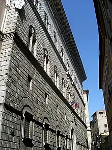 The Palazzo Piccolomini, also known as the Palazzo Todeschini Piccolomini is a Renaissance-style palace in the city of Siena, region of Tuscany, Italy. It is located on the Banchi di Sotto, at the corner with Via Rinaldini; uphill and west of the church of San Martino, the Loggia del Papa, and the Palazzo delle Papesse, which also built by a Piccolomini family member.
