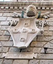 The palace was erected by Giacomo and Andrea Piccolomini, nephews of Pope Pius II; the designs were requested from Bernardo Rossellino. Construction proceeded between 1460 and 1495. The palace recalls the Palazzi Medici Riccardi and Ruccellai in Florence, with the rough ashlar block surface and mullioned windows. The sculptural additions were completed by Antonio Federighi and Urbano da Cortona.[1]