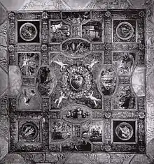 The ceiling of the hall was divided into squares by gilded stucco with fresco figured panels of various shapes. It is now in the Metropolitan Museum of New York City. At the center is a coat of arms within a wreath. On the four sides of the central compartment are ovals with scenes of the Rape of Europa, Helle rides the ram, Nymph riding a seahorse and the Judgment of Paris. Two additional compartments depict Hercules and Omphale and the Calydonian boar hunt. Among the oval and curved panels are pairs of irregular hexagons with Triumphs and other scenes with chariots, a total of eight, including a Triumphs of Alexander the Great, the Rape of Proserpine and Triumphs of Cybele, Proserpine, Amphitrite and the Sun. Finally, the corners are four medallions within boxes decorated with grotesques, which depict couples and groups of mythological characters: Bacchus and Silenus, Pan, Priapus Satyr and Nymph, Venus and Cupid, the Three Graces.