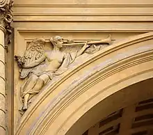 The large building, erected to a design by architect Vincenzo Micheli (1895), defines itself as a scenographic backdrop to the square, laid out from 1883 with the destruction of the Mercato Vecchio and the Jewish pond. Beyond its being a palace, the architecture transcends the need to offer a civil dwelling building in the bourgeois sense, to become a monumental urban sign, and impose itself through the great archway leading onto Via Strozzi, developed to include the two orders of the façades of the lateral buildings, each of which is developed for a further six axes, the last of which is overhanging. Each of these lateral bodies then develops deeply into the respective blocks, two internal courtyards towards via Brunelleschi, and an elongated one towards via Pellicceria. The wide and high archway with the large central body, adorned with statues and crowned by the plastic group of the Italy enthroned accompanied by the figures of Art and Science (removed in 1904), framed the equestrian statue of the king Victor Emmanuel II of Savoy, placed in the centre of the square and later moved to the Piazzale delle Cascine.[4] The three statues were mockingly renamed by the Florentines with the names of three prostitutes of the period, as can be found in some satirical sonnets of the time by Vamba and others: the Starnotti or Schiccherona, a tenant of Russian origin whose surname was Starnowka; then the Cambarbini and the Trattienghi.[5]