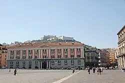 Palazzo della Prefettura from Piazza del Plebiscito, above in the far hill, the Certosa di San Martino.