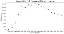 Palo Alto County is a county located in the U.S. state of Iowa. As of the 2020 census, the population was 8,996.[1] The county seat is Emmetsburg.[2] It is named after the Battle of Palo Alto, the first major battle of the Mexican–American War.[3]
