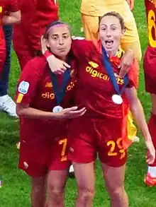 ![]() Andressa Alves (left), and Paloma Lázaro (right) celebrate winning the 2022 Supercoppa Italiana | |||