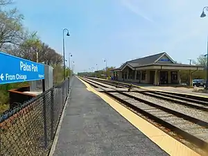 Palos Park is a station on Metra's SouthWest Service in Palos Park, Illinois. The station is 19.8 miles (31.9 km) away from Chicago Union Station, the northern terminus of the line.[3] In Metra's zone-based fare system, Palos Park is in zone E. As of 2018, Palos Park is the 112th busiest of Metra's 236 non-downtown stations, with an average of 424 weekday boardings.[2]