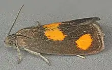 Pammene aurana has a wingspan of 9–13 mm.[4] These moths show chocolate brown or reddish brown forewings with yellow-orange blotches. They usually have two almost round yellow-orange spots before the wing's outer edge and a large round or semicircular yellow-orange marking in the middle at the wing's rear edge. The fringes are dark brown. The hind wings are dark. Head, thorax, abdomen and antennae are brown to dark brown. In the form Pammene aurana var. aurantiana the various yellow-orange markings flow together and only the wing base, the costa and the outer edge are brown.