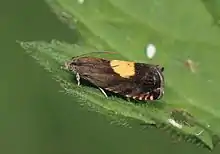 The wingspan is about 13–16 millimetres (0.51–0.63 in). The forewings are dark fuscous. The posterior of the costa has whitish strigulae yellower beneath. There is a rather large yellow pentagonal median dorsal blotch, not nearly reaching the tornus and sometimes with a few dark fuscous scales. A streak from costa beyond the middle and the margins of ocellus are bluish metallic. The hindwings are dark fuscous, in male with blackish suffusion on 1c towards termen. The larva is whitish ; head brown ; plate of 2 pale ochreous.[3]
