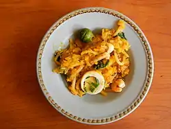 Pancit Malabon is a Filipino dish that is a type of pancit which originates from Malabon, Metro Manila, Philippines. It uses thick rice noodles. Its sauce has a yellow-orange hue, attributable to achuete (annatto seeds), shrimp broth, and flavor seasoned with patis (fish sauce for a complex umami flavor) and taba ng talangka (crab fat). Local fresh seafood toppings may include cooked shrimp, squid, smoked bangus (milkfish), mussels, and/or oysters. Other optional garnishes can include pork, hard-boiled duck/hen eggs, crushed chicharrón (pork rinds), chopped green onions, lightly browned sautéed minced garlic, and spritz of calamansi juice.[1]