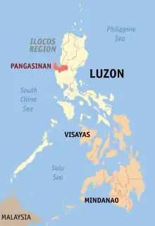 Pangasinan's 3rd congressional district is one of the six congressional districts of the Philippines in the province of Pangasinan. It has been represented in the House of Representatives of the Philippines since 1916 and earlier in the Philippine Assembly from 1907 to 1916.[3] The district consists of the city of San Carlos and adjacent municipalities of Bayambang, Calasiao, Malasiqui, Mapandan and Santa Barbara. It is currently represented in the 19th Congress by Maria Rachel Arenas of the Lakas–CMD.[4]