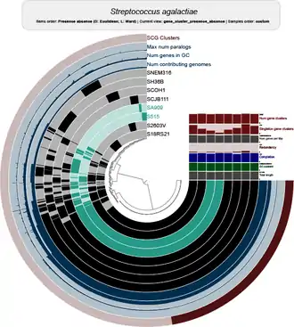 In 2020 Anvi'o[1] was available as a multiomics platform that contains pangenomic and metapangenomic analyses as well as visualization workflows. In Anvi'o, genomes are displayed in concentrical circles and each radius represents a gene family, allowing for comparison of more than 100 genomes in its interactive visualization. In 2020, a computational comparison of tools for extracting gene-based pangenomic contents (such as GET_HOMOLOGUES, PanDelos, Roary, and others) has been released.[68] Tools were compared from a methodological perspective, analyzing the causes that lead a given methodology to outperform other tools. The analysis was performed by taking into account different bacterial populations, which are synthetically generated by changing evolutionary parameters. Results show a differentiation of the performance of each tool that depends on the composition of the input genomes. Again in 2020, several tools introduced a graphical representation of the pangenomes showing the contiguity of genes (PPanGGOLiN,[46] Panaroo[65]).