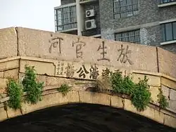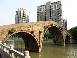 Construction of the Pangong Bridge, designed by scholar-official and hydrologist Pan Jixun, commenced in 1585 and was completed in 1590, during the ruling of Wanli Emperor of the Ming dynasty (1368–1644).[1][2] In 1839, in the 19th year of the Daoguang period of the Qing dynasty (1644–1911), the original five-hole stone beam bridge was changed into a three-hole stone arch bridge to increase the water discharge.[1]