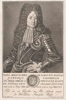 Paolo Alessandro Maffei (11 January 1653 – 26 July 1716)[1] was an antiquarian with a humanist education, who was active in Rome. Maffei was the son of Paolo Maffei and his wife Giovanna di Raffaele, both of patrician families of Volterra. He was a descendant of the humanist and papal bureaucrat Raffaello Maffei, "il Volterrano,"[2] (1451–1522), author of the Commentaria urbana (1506), dedicated to Julius II. Paolo Alessandro was made a cavaliere of the Tuscan Order of Saint Stephen and an honorary member of the Papal Guard.[3] He wrote the laudatory biography of Pope Pius V,[4] in which he praised the Pope's suppression of newsletters and slanderous printed avvisi in 1572.[5]