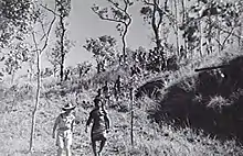 At dawn C Company, PIB moved back to the beach to regroup, with Lieutenant Colin Rice assuming temporary command as the platoons prepared to set off towards their objectives.[156] 10 Platoon cleared the beach north toward Bonga which was found to have been vacated, while 9 Platoon moved south, conducting a reconnaissance along the Sattelberg Road in the direction of Tareko. The following morning they moved up the road towards Jivevaneng, probing in front of the advancing Australians.[158] Reaching the mission station 9 Platoon found it deserted, and it was subsequently occupied.[159] An area of tactical importance due to its dominating position and the observation it provided, D Company, 2/17th Battalion pushed past the mission, and by 25 September was 5 kilometres (3.1 mi) west before meeting resistance. Confronted by a strong Japanese force, the Australians were forced back to Jivevaneng, but repelled six strong attacks on their position over the following days before being relieved by two platoons from the 2/43rd Battalion under Captain Eric Grant.[160] On 30 September Grant's understrength company and the Papuans from 9 Platoon were surrounded and cut-off but were able to hold off a number of attacks over the next four days. An attempt by two other Australian companies to break through failed before a PIB sergeant and a group of scouts from the main force was finally guided into the position by two Papuans that had been sent out to through Japanese lines. On 4 October they led the encircled force out carrying their wounded, just hours before a relief force finally pushed its way through.[159][161][162] Meanwhile, Finschhafen had fallen two days earlier.[81] During this time 10 Platoon had been working with the 2/3rd Pioneer Battalion which was guarding the approach between the Song River and North Hill.[159]