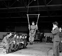 Parachute training was a 12-day course carried out at the No. 1 Parachute Training School, RAF Ringway. Recruits initially jumped from a converted barrage balloon and finished with five parachute jumps from an aircraft.[13] Anyone failing to complete a parachute jump was returned to his old unit. At the end of the course, new Paras were presented with their maroon beret and parachute wings and posted to a parachute battalion.[13][14] Parachute training was not without its dangers; three men were killed in the first 2,000 parachute jumps at Ringway.[13]