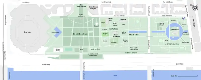 Composed of three different gardens on different themes connected by foot bridges, the Parc de Bercy is Paris's tenth largest park. It is accessible by Bercy and Cour Saint-Émilion Métro stations, as well as by a foot bridge to the Mitterrand site of the Bibliothèque nationale de France (BnF) on the other side of the Seine. The AccorHotels Arena, colloquially known as Bercy in Paris, is located on the park's northern edge.[3]