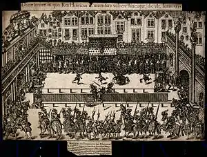 Plays were also performed at the royal court. The first classical French tragedy, Cléopâtre captive by Étienne Jodelle, was performed before Henry II in February 1553.[25] Ballets also became popular at the French court, and were performed to celebrate weddings and other special occasions. The first performance of Circé by Balthazar de Beaujoyeux was performed at the Louvre on 24 September 1581, to celebrate the wedding of Anne de Joyeuse, a favorite of the King, with Marguerite de Vaudémont. [26]