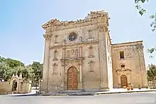 The church's façade has Corinthian pilasters, and the central bay has an arched main doorway flanked by columns on either side. The door is topped by five escutcheons containing coats of arms, including those of King Philip II of Spain, Grand Master Alof de Wignacourt, Bishop Baldassare Cagliares and the parish priest Don Filippo Borg.[4] The stonework around the doorway and the coats of arms is very ornate, and it is probably influenced by the Spanish Plateresque style.[9] Each of the two side bays contains three empty niches.[10]