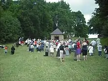 A parish festival[1] or parish fair[2] or indulgence feast[3] (Lithuanian: atlaidai; Polish: odpust parafialny) is a local annual festival held by Roman Catholic churches in Poland and Lithuania on a feast day of the patron saint of a given parish. Many of the festivals have long historic traditions that date back to the Counter-Reformation in the 16–17th centuries. Almost every parish has such festival with some churches having several.[4] Participants in these festivals can receive indulgences for themselves and their dead relatives.[5] The festivals include masses, religious processions, performances by church choirs, other music performances[6] and are often accompanied by traditional craft markets.[4] The feasts reinforce local identity and foster a sense of community.[4] Some of the larger festivals, like the Great Žemaičių Kalvarija Festival, last for a week, attract thousands of people, and are major pilgrimage events.[3][4]
