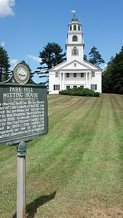 ![]() Park Hill Meetinghouse with New Hampshire Historical Marker No. 74 in the foreground | |