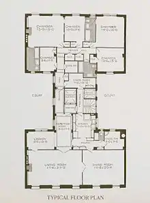 Originally, the building consisted of one apartment per floor, consisting of 6 bedrooms, 4 bathrooms, a library and a 17.5 by 47.5 feet (5.3 by 14.5 m) drawing room and dining room.