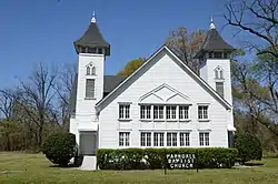 The Parkdale Baptist Church (also known as First Baptist Missionary Church of Parkdale) is a historic Baptist church building at 137 Bride Street in Parkdale, Arkansas. The Late Gothic Revival style building was constructed in 1910, and is one of comparatively few buildings in southeastern Arkansas in that style. The building follows a modified cruciform plan. Its main Gothic Revival features include the pointed arch windows that predominate, twin towers, and gable ends with patterned-glass windows.[2]