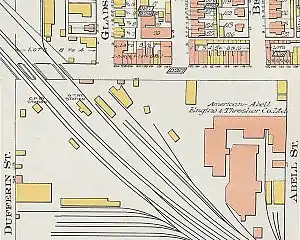 The first station was built in 1856 by the Ontario Simcoe and Huron Union Railroad Company, which later became the Northern Railway of Canada in 1858. It was a small wooden building situated to the east of the lines, south of Gladstone Avenue and the Gladstone Hotel at Queen Street. In 1885, it was expanded and re-oriented to face the rail lines.[1] The track traversed Dufferin and Queen Streets at an angle, just east of the intersection, at a level crossing from the north-west to the south-east.