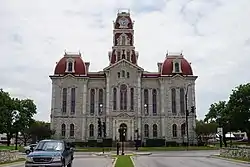 The Parker County Courthouse is an historic building located at Courthouse Square in Weatherford, Texas, the seat of Parker County. Built in 1884–1886, it was the county's fourth courthouse; the first was a wooden building, and the second and third both burned down. Architect Wesley Clark Dodson, who designed at least six courthouses in Texas, designed the Second Empire building. The three-story limestone building is visually divided into five bays; the end and central bays are projecting and feature stone pilasters at their corners. The second-story windows are tall and arched, and the roof line features bracketing around the eaves. The red shingled roof has two mansards atop the ends and a three-story tower in the center; each piece features dormers and a widow's walk, while the tower has louvers and a clock on its upper stories.[2]