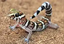 Patterning is variable within the species, with the crossbands being more distinct in some individuals while in others they are almost totally obscured, and tails which have been regenerated may have a variegated instead of banded pattern. Smaller individuals have been noted to be brighter colored and show greater contrast between the dark and light areas of the body (particularly in the crossbands), a phenomenon also observed in juvenile ocelot geckos and Mocquard's Madagascar ground geckos. This lizard can be distinguished from related species by its distinct coloration and patterning, the separation of the nostril from the rostral scale, and the presence of smaller scales between large tubercles.[2]